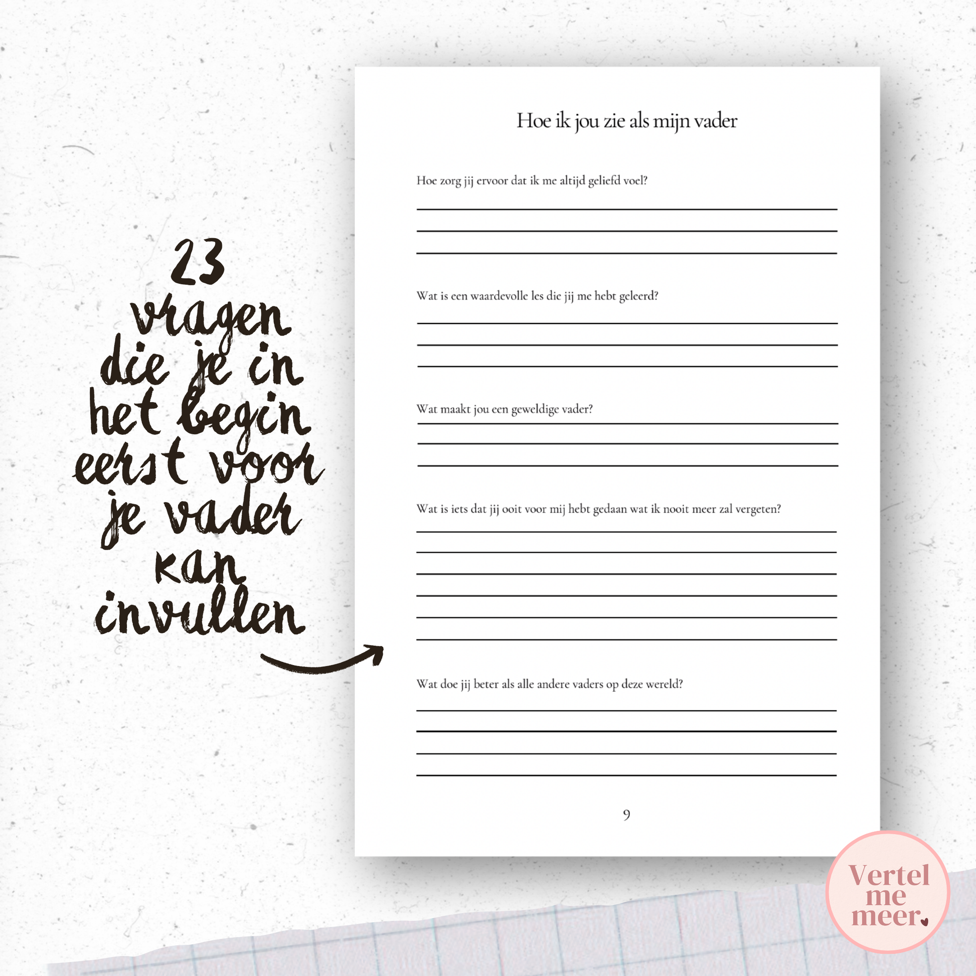 1. In het eerste deel vul jij als zoon of dochter zelf vragen over je vader in en kun je persoonlijke vragen toevoegen die je altijd al hebt willen stellen.